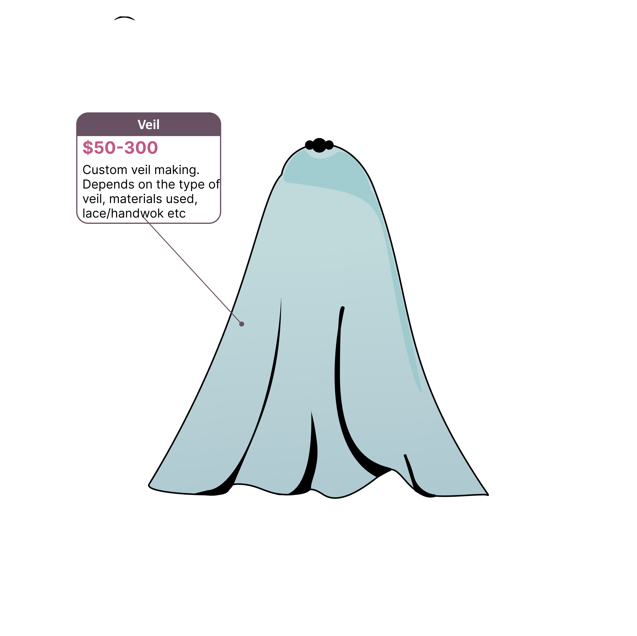 We design all types of veils, including cathedral veils, chapel veils, birdcage veils, and angel-cut veils. From shorter veils to Veil Long designs, we create custom veils tailored to your needs.