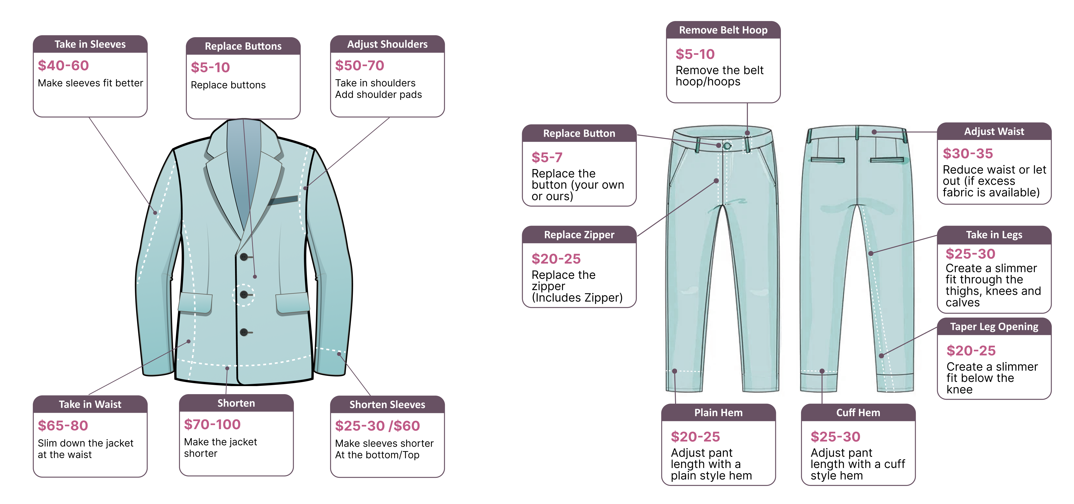 Our alteration prices are competitive and depend on the type of alteration needed. Please see the graphic above for our pricing schedule.
