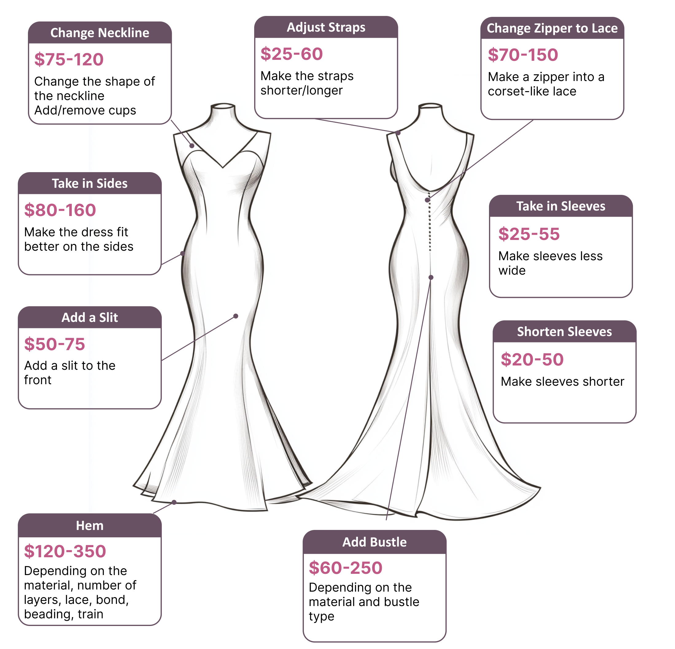 Prices vary depending on the complexity of the alterations. Please refer to the image above on the page for our detailed price list.